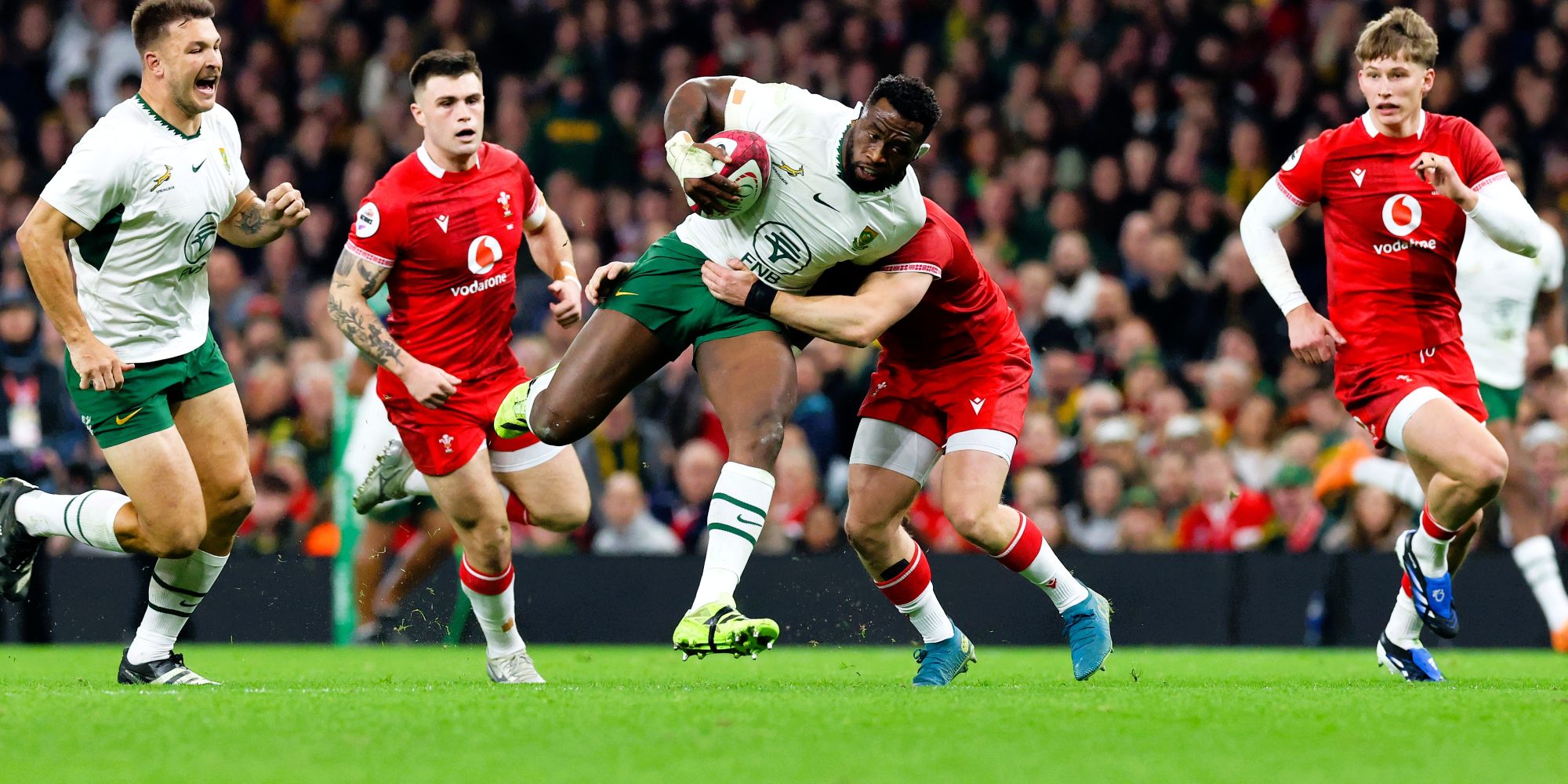 After 40 minutes, two converted tries by Godlen Masimla (scrumhalf) – the second with his direct opponent, Stefan Ungerer in the sin-bin – and a third by Sergeal Petersen (fullback), moments before the break, ensured the visitors were in the lead by 24-13.
