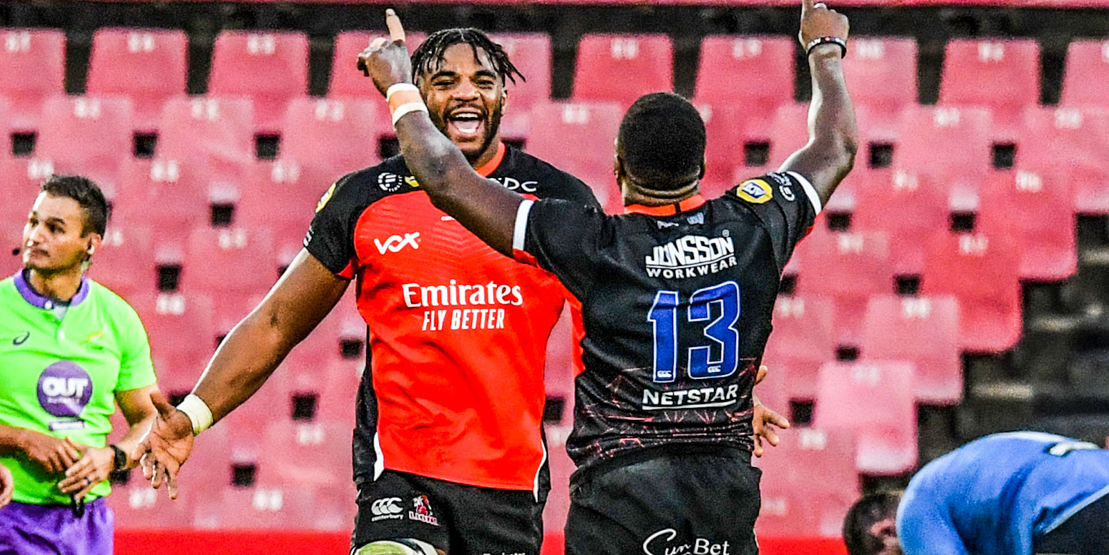 Bongi Mbonambi and Handre Pollard on defence.