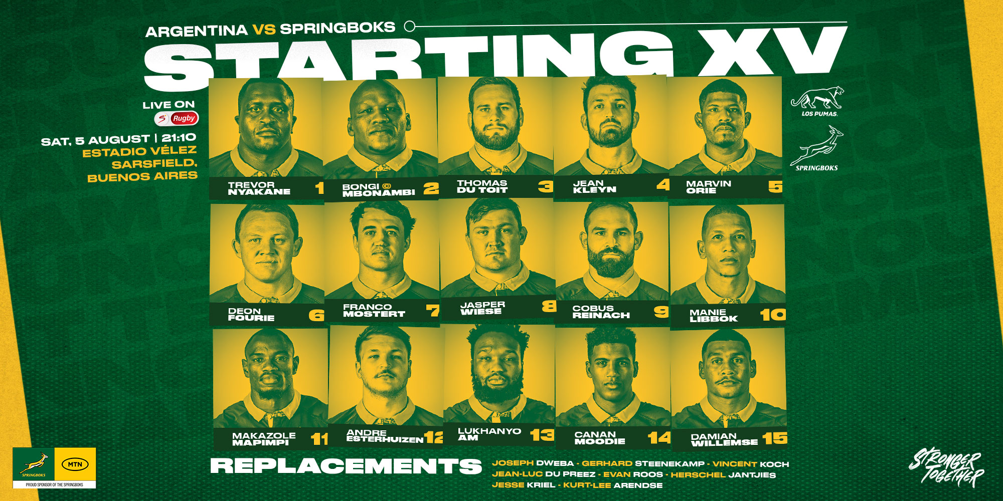 The Pumas are renowned for their physicality and passion, and Stick and Mbonambi expected an even bigger challenge from the South Americans on their home patch this weekend, especially with replacement hooker Agustin Creevy set to become the first player in their history to reach 100 Test caps.