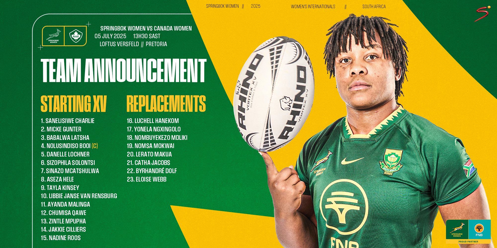 Springbok Women captain Nolusindiso Booi said her team will enter Loftus Versfeld with excitement and determination when they face Canada at 13h30 on Saturday, in the first Test between the two countries on South African soil.